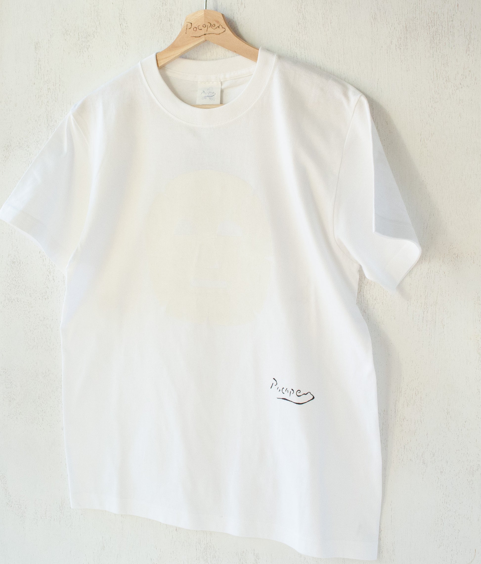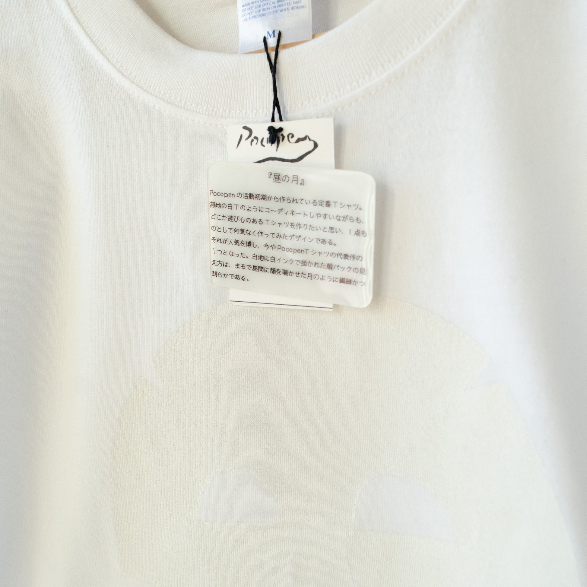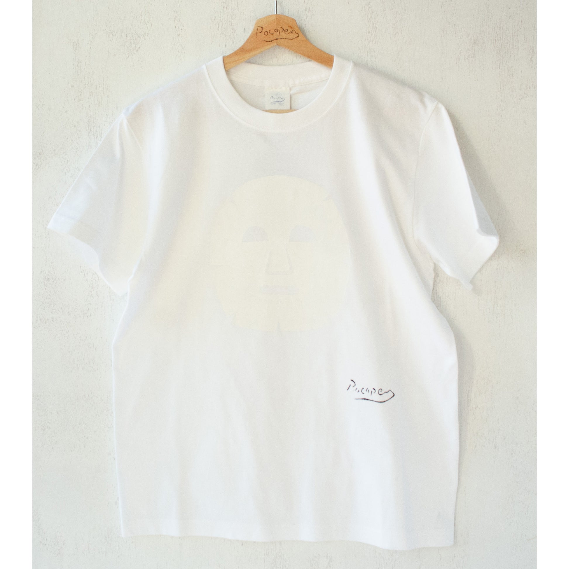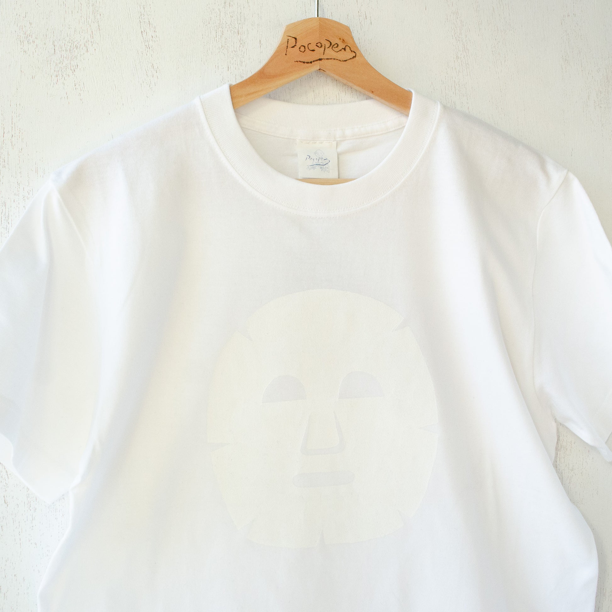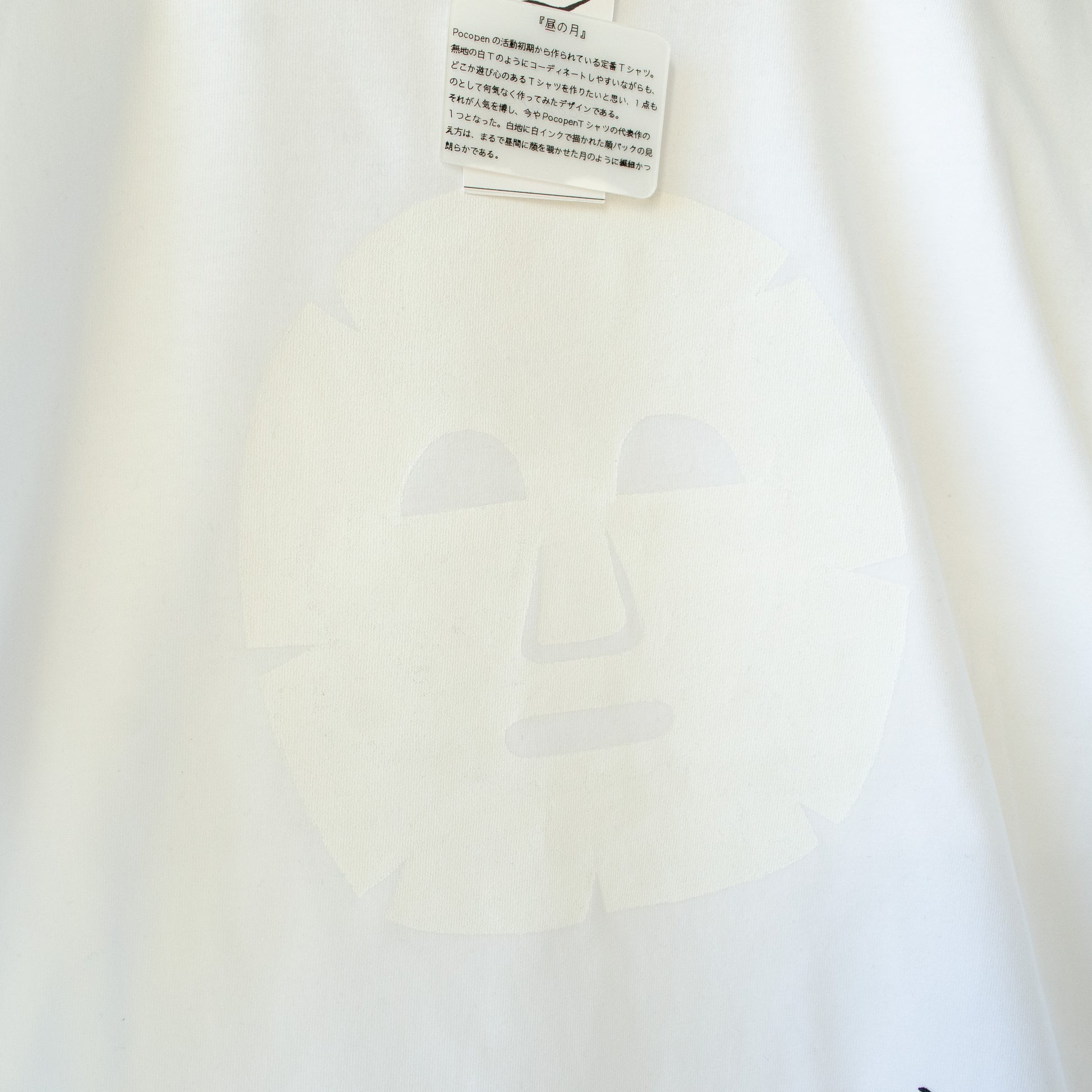 無地の白Tのようにコーディネートしやすいながらも、どこか遊び心のあるTシャツを作りたいと思い、1点ものとして何気なく作ってみたデザインである。それが人気を博し、今やPocopenTシャツの代表作の一つとなった。白地に白インクで描かれた顔パックの見え方は、まるで昼間に顔を覗かせた月のように繊細かつ朗らかである。