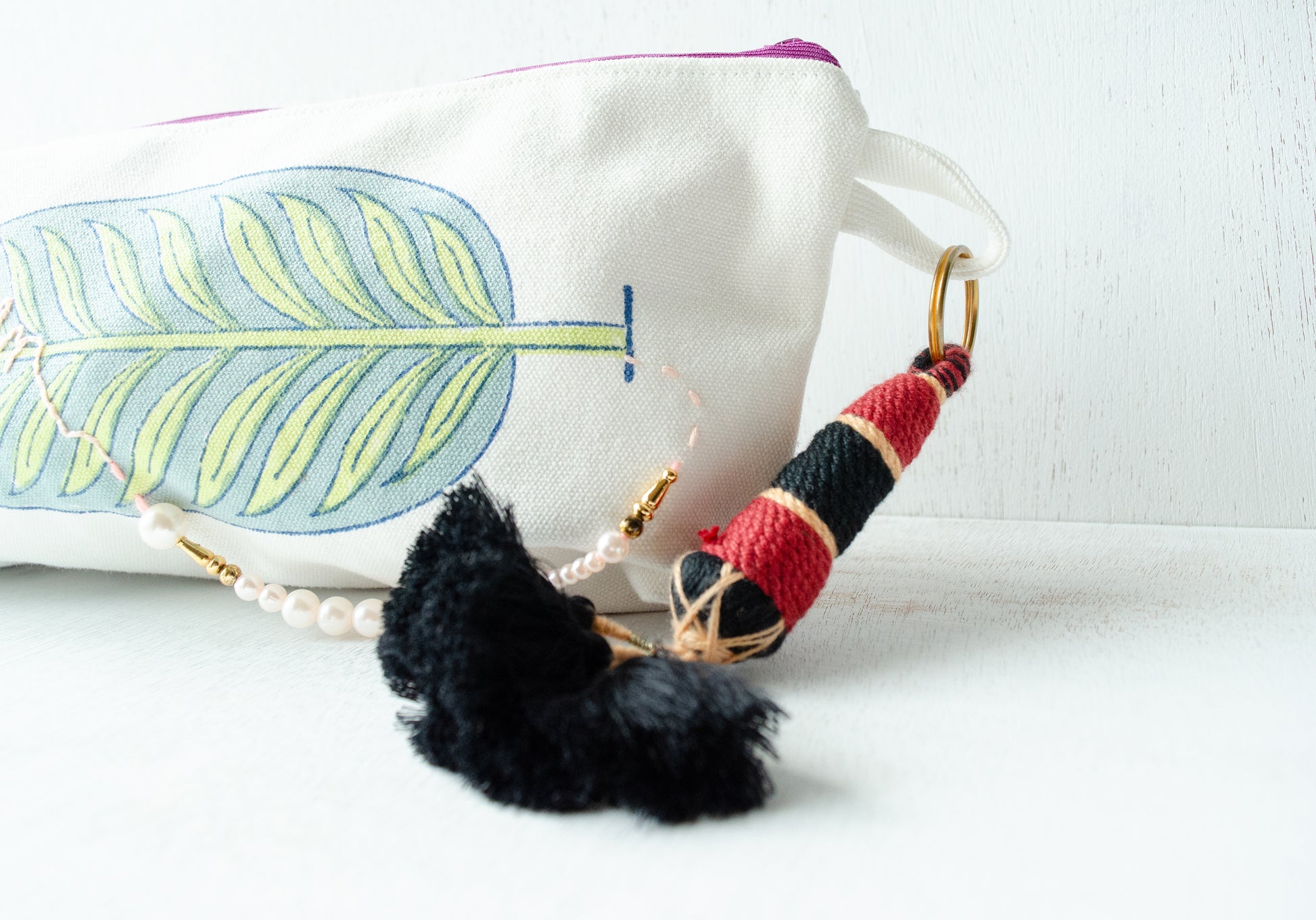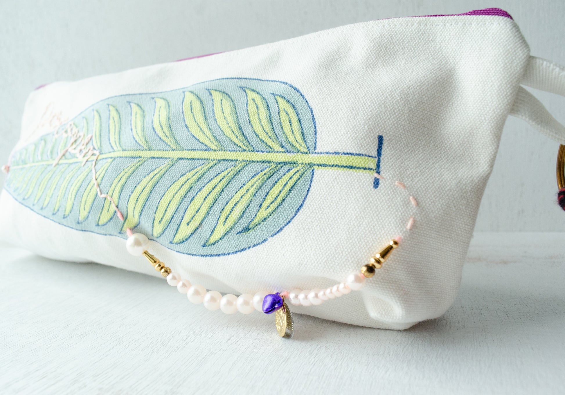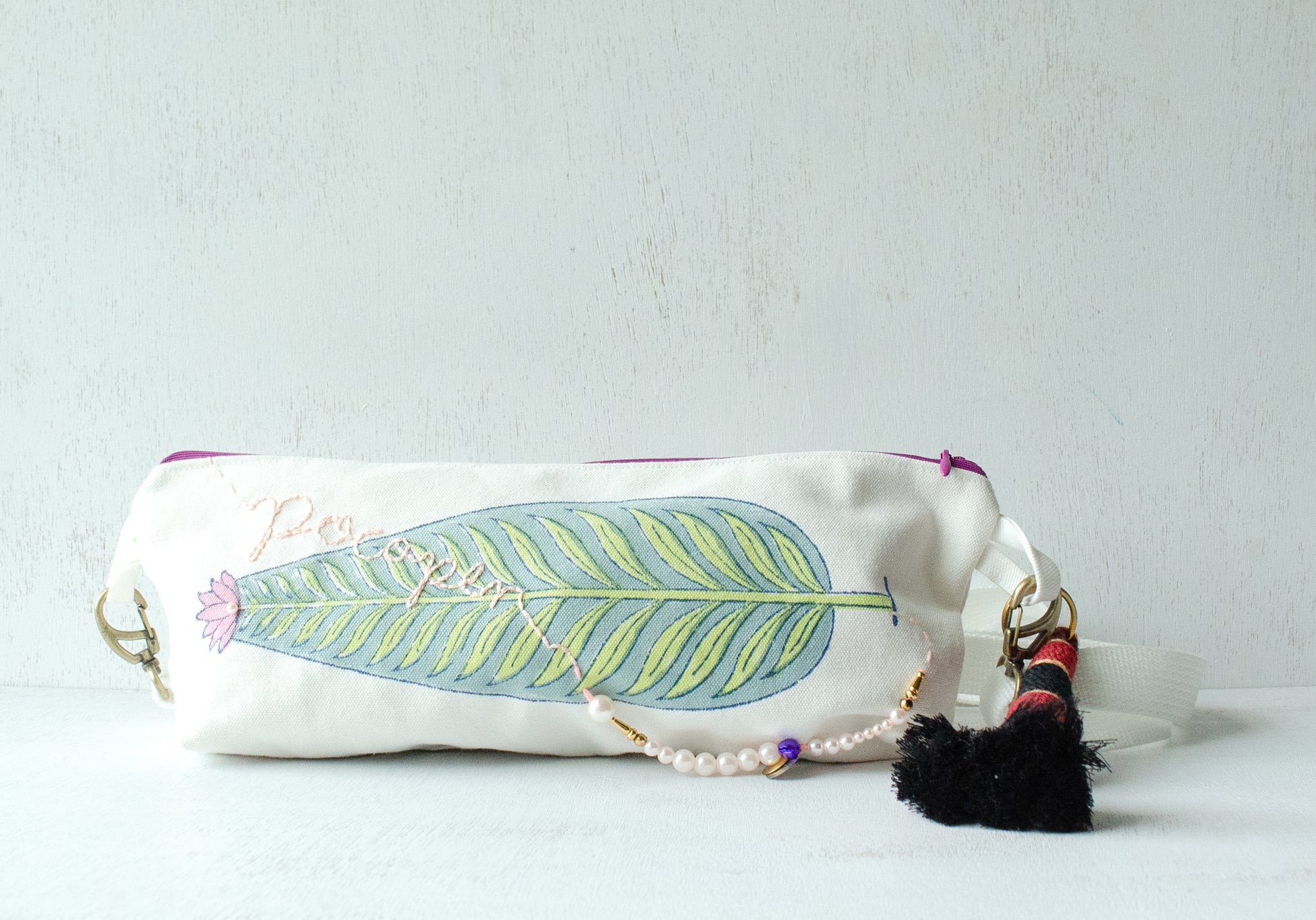 キャンバス地の大柄のデザインに、手刺繍とビーズでひとつひとつ違った仕上がり。装飾やオーナメントも、ポシェットごとに馴染みつつ存在感あるものにしています。