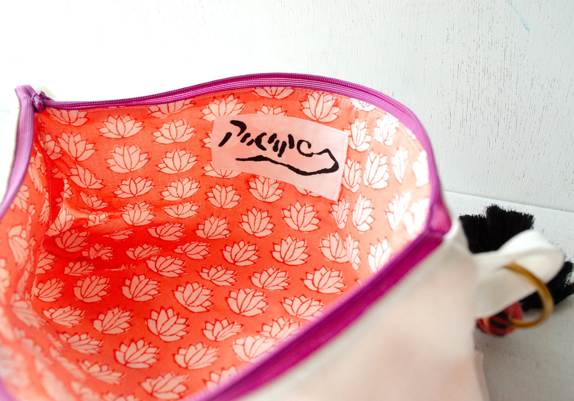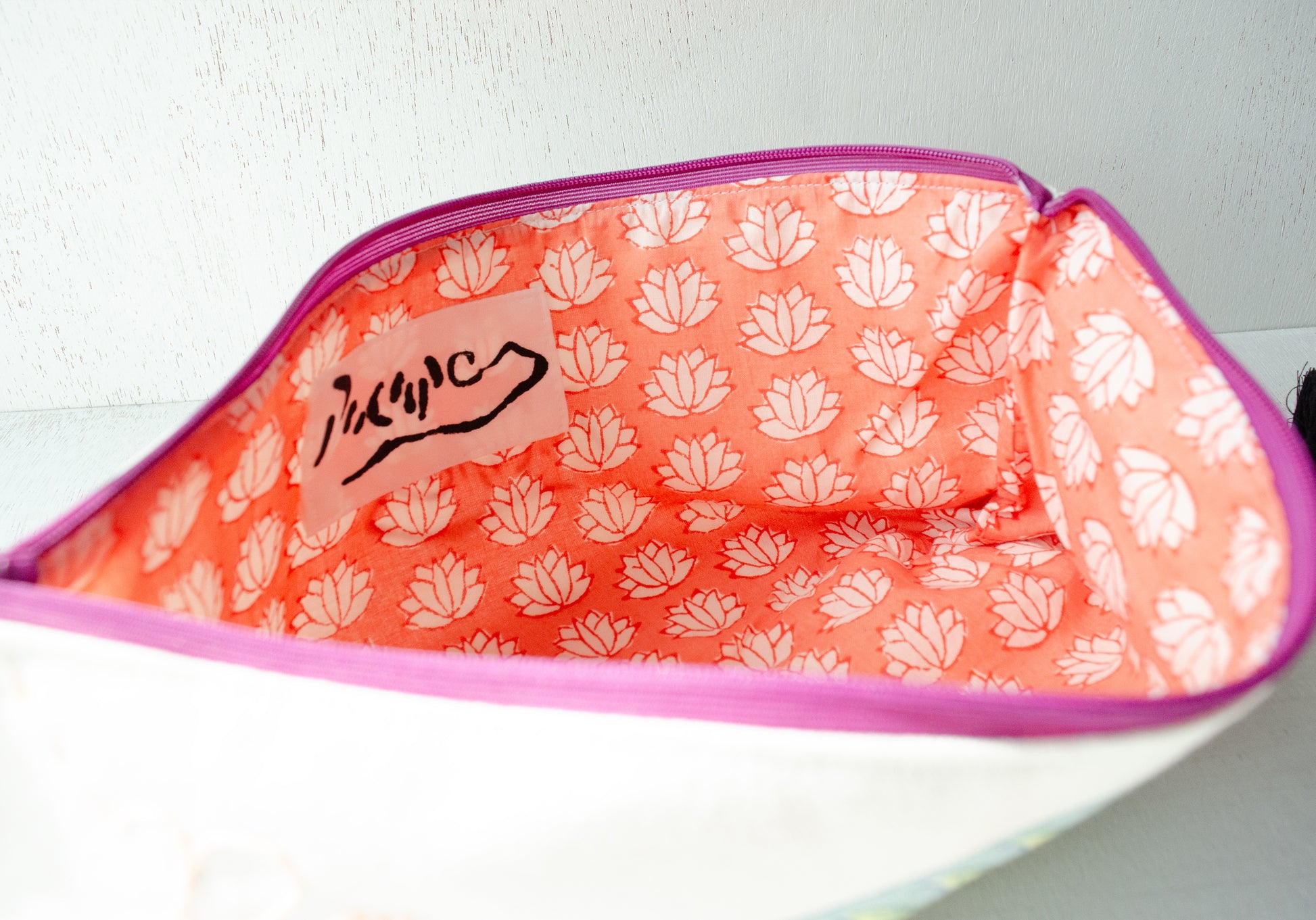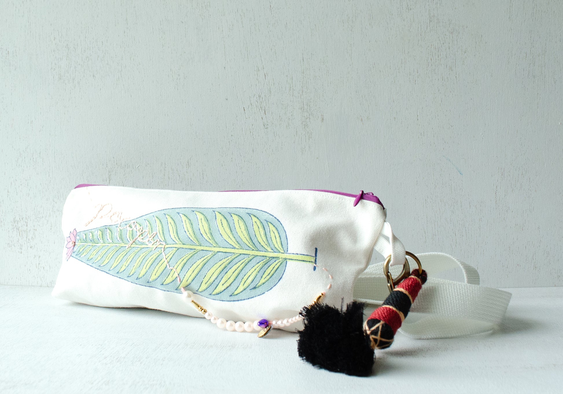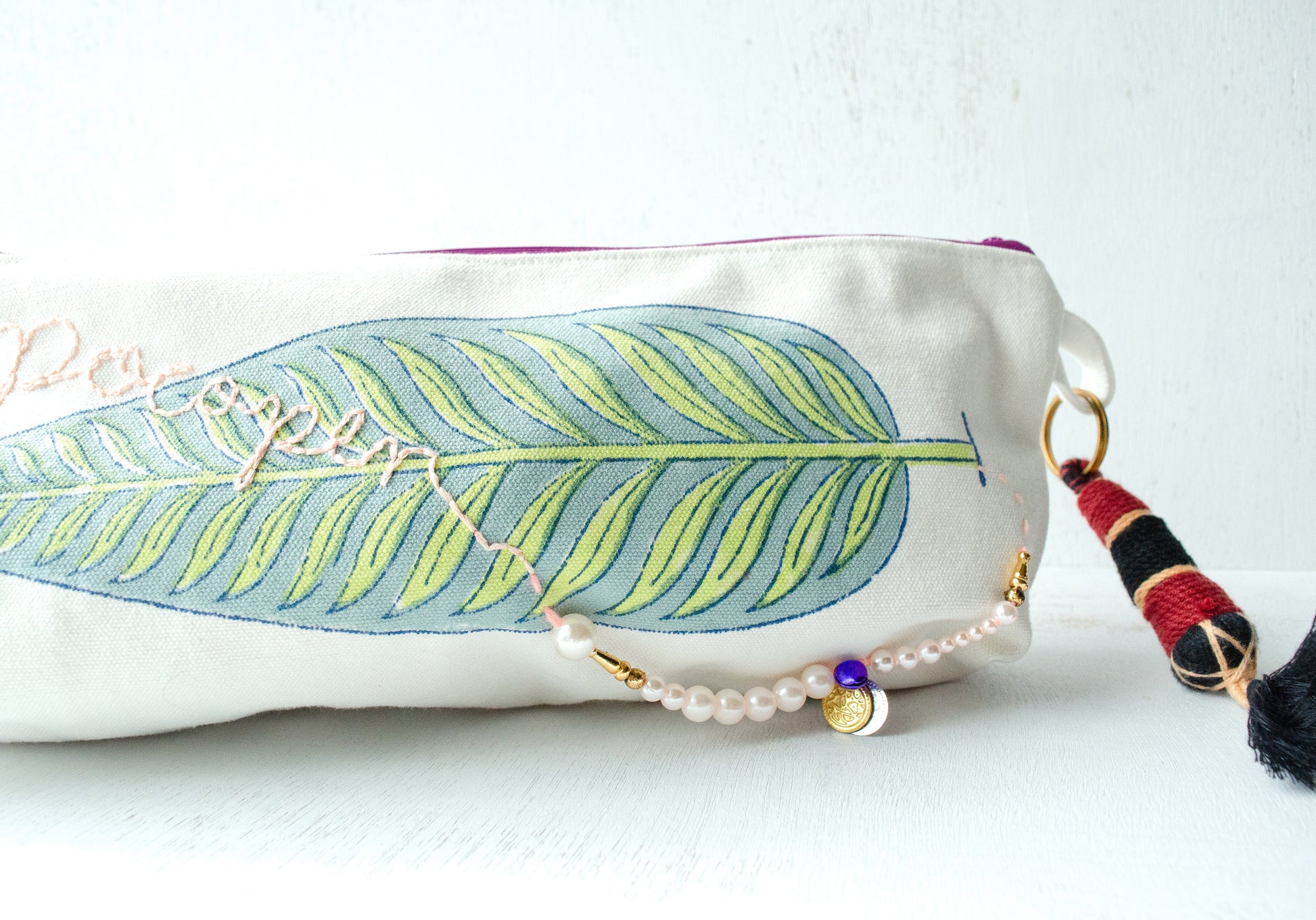 キャンバス地の大柄のデザインに、手刺繍とビーズでひとつひとつ違った仕上がり。装飾やオーナメントも、ポシェットごとに馴染みつつ存在感あるものにしています。