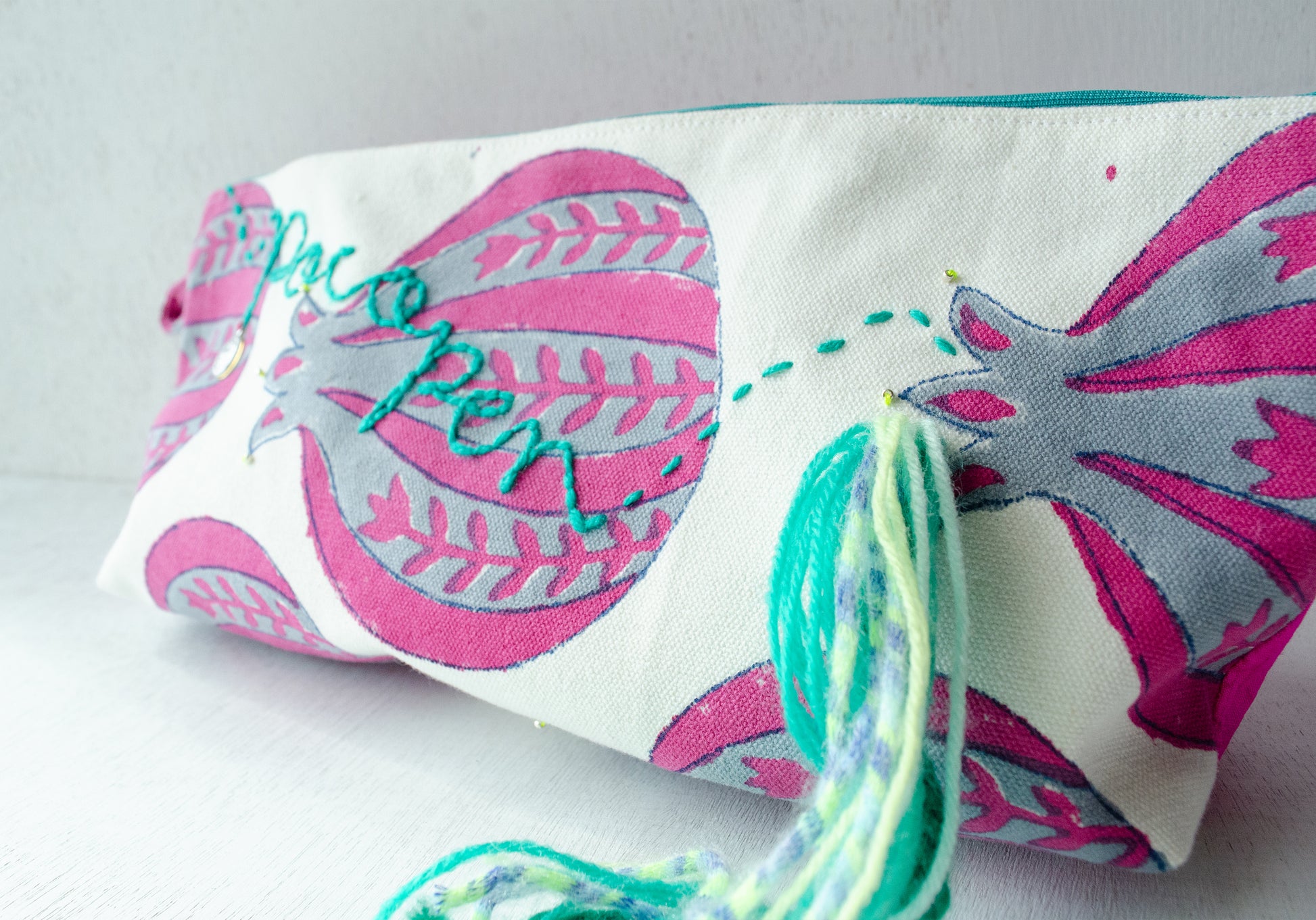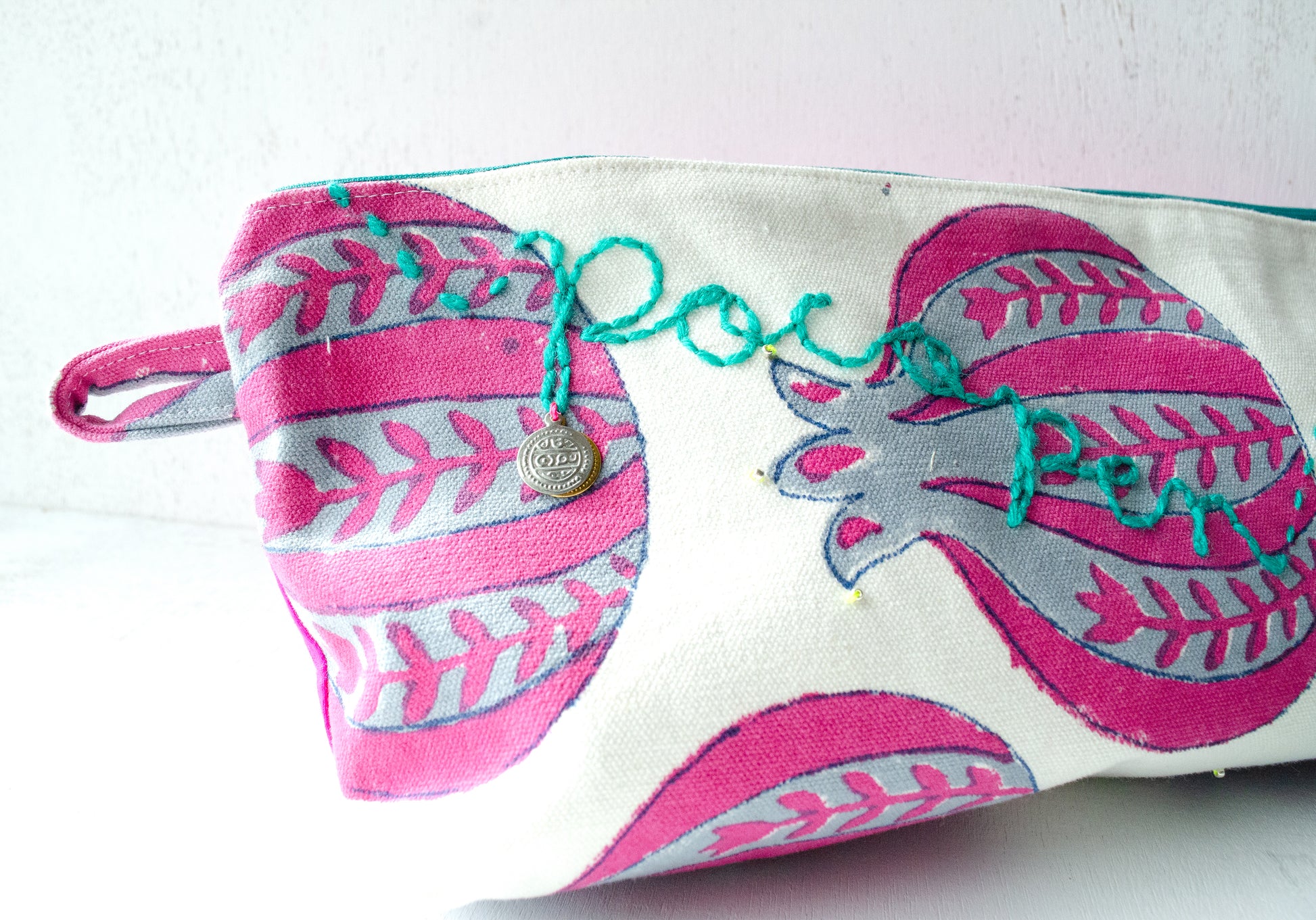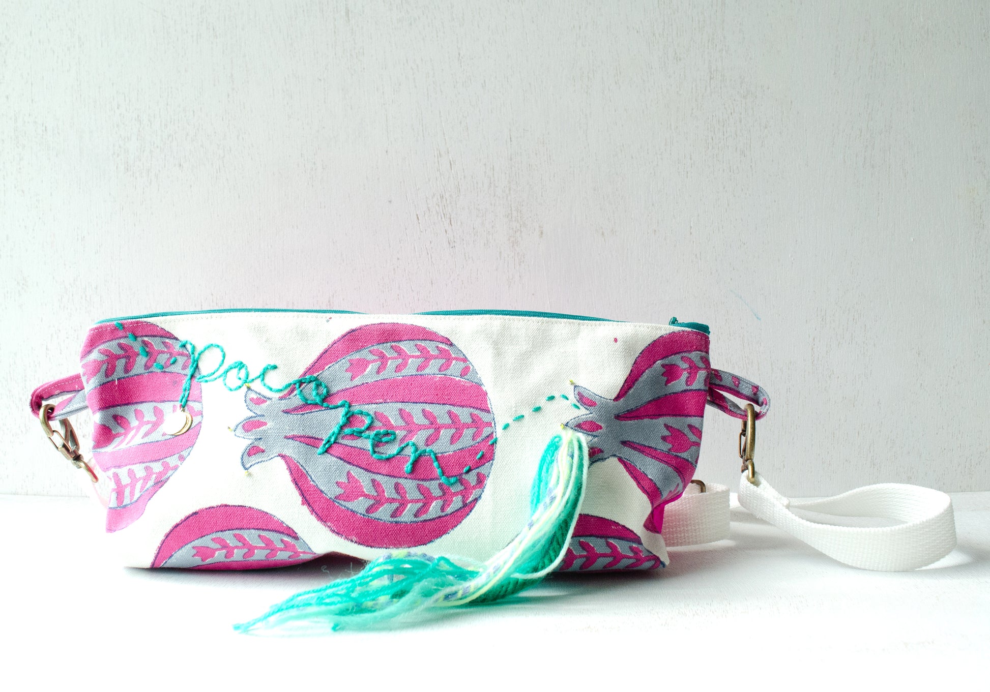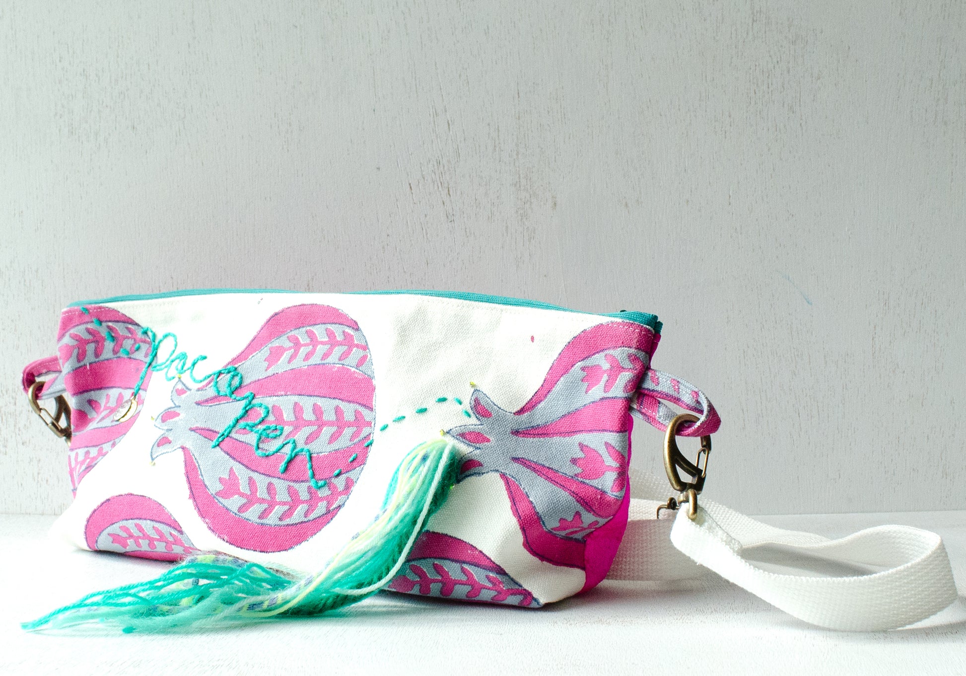 キャンバス地の大柄のデザインに、手刺繍とビーズでひとつひとつ違った仕上がり。装飾やオーナメントも、ポシェットごとに馴染みつつ存在感あるものにしています。