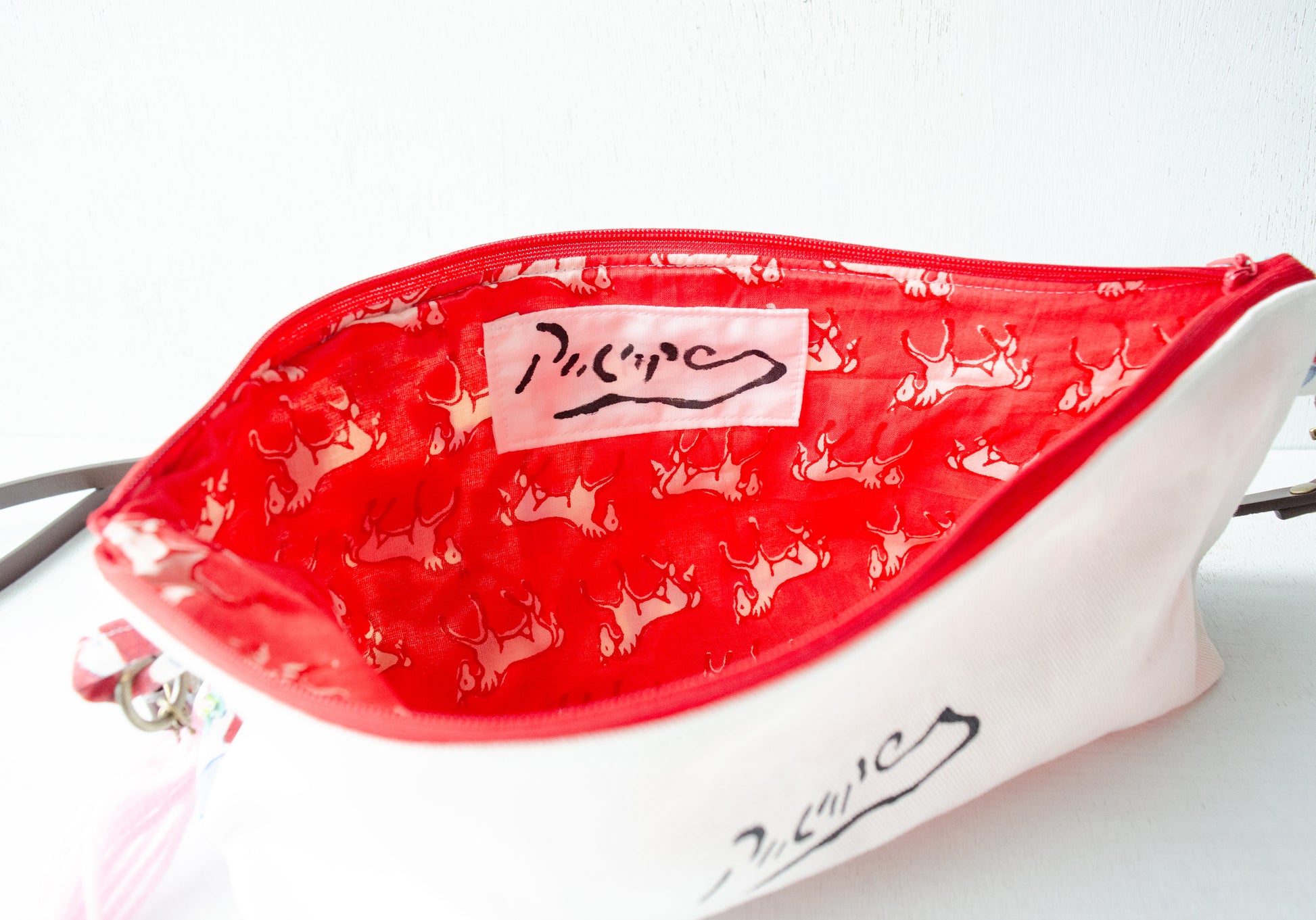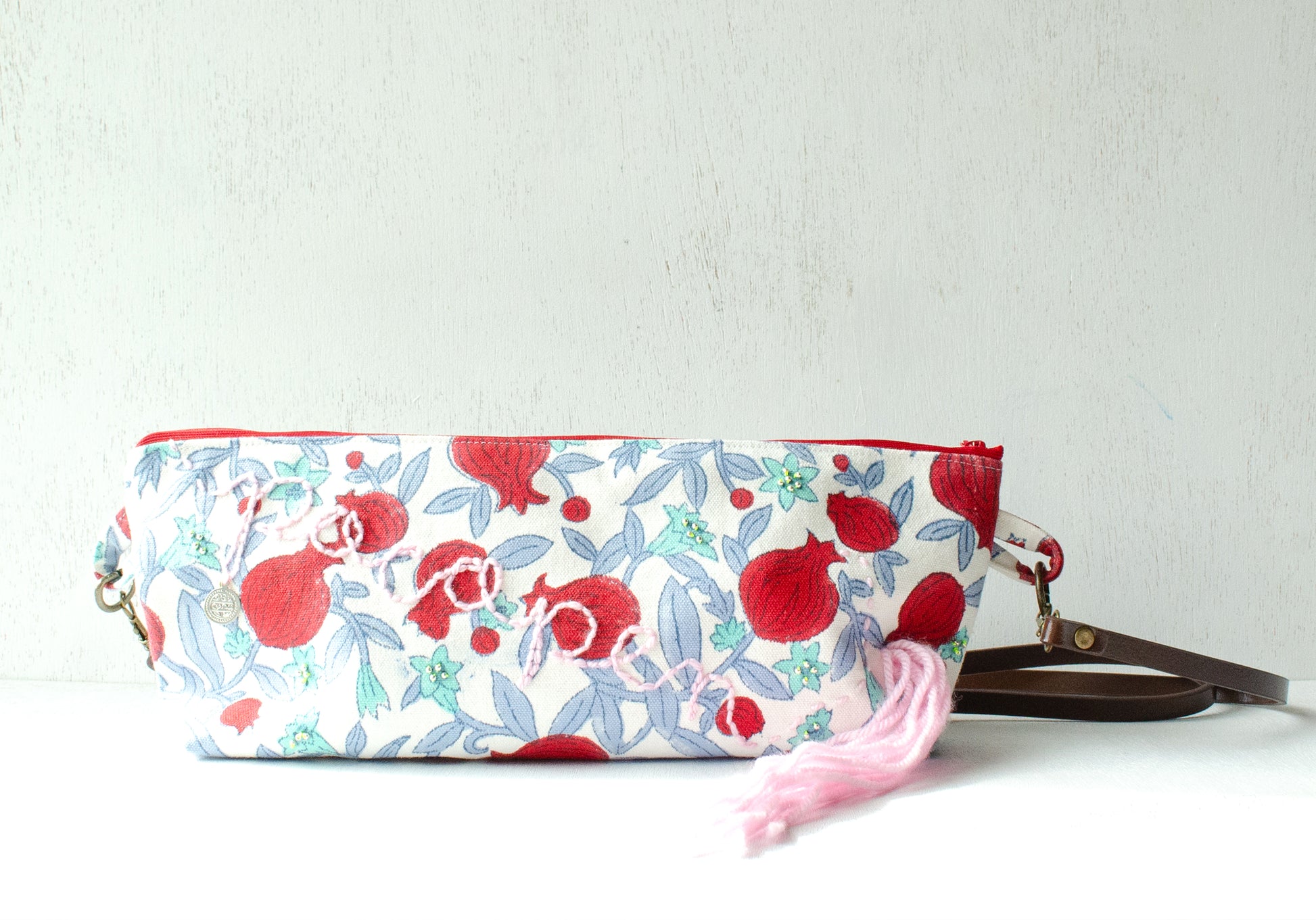 キャンバス地の大柄のデザインに、手刺繍とビーズでひとつひとつ違った仕上がり。装飾やオーナメントも、ポシェットごとに馴染みつつ存在感あるものにしています。