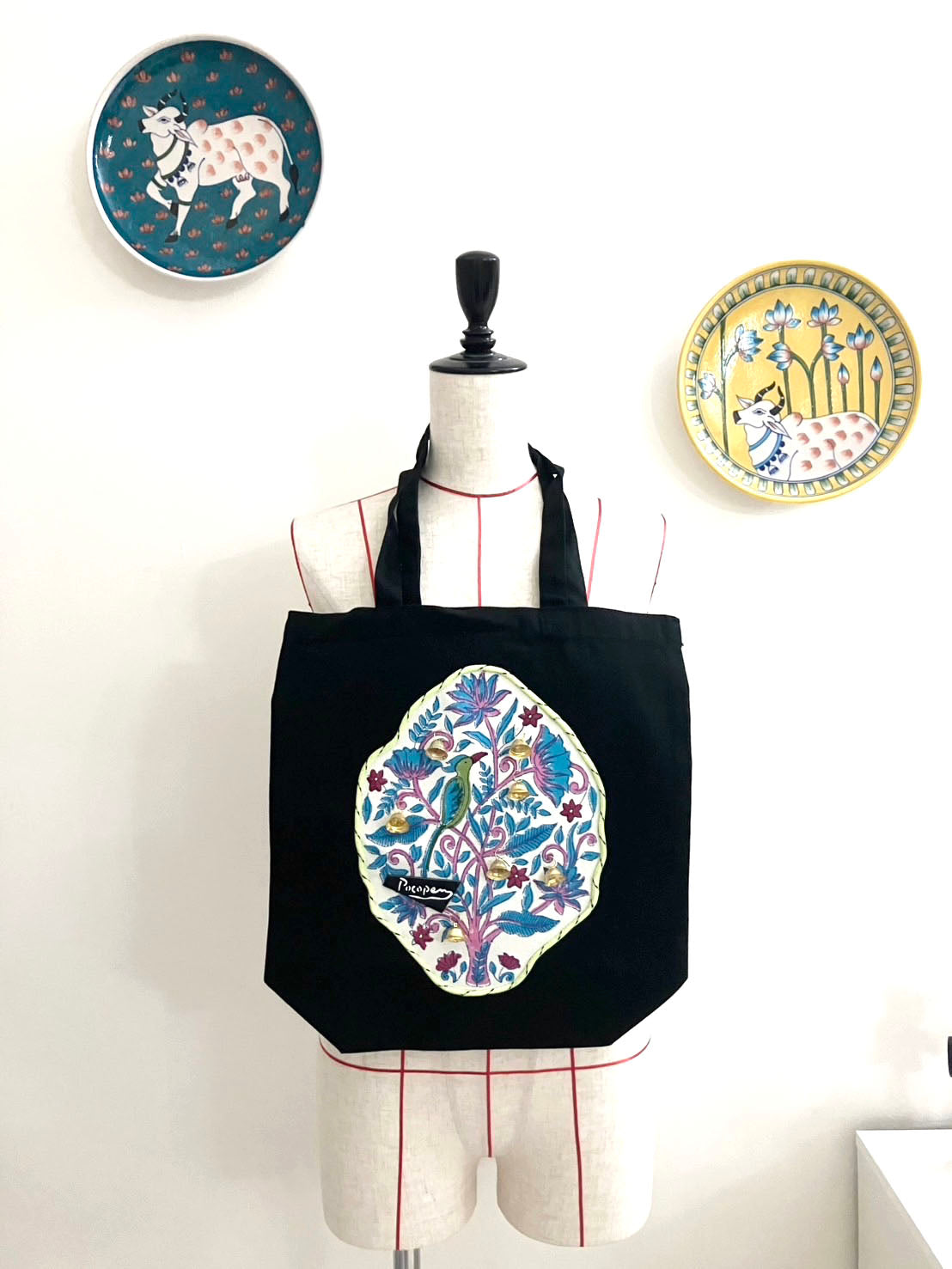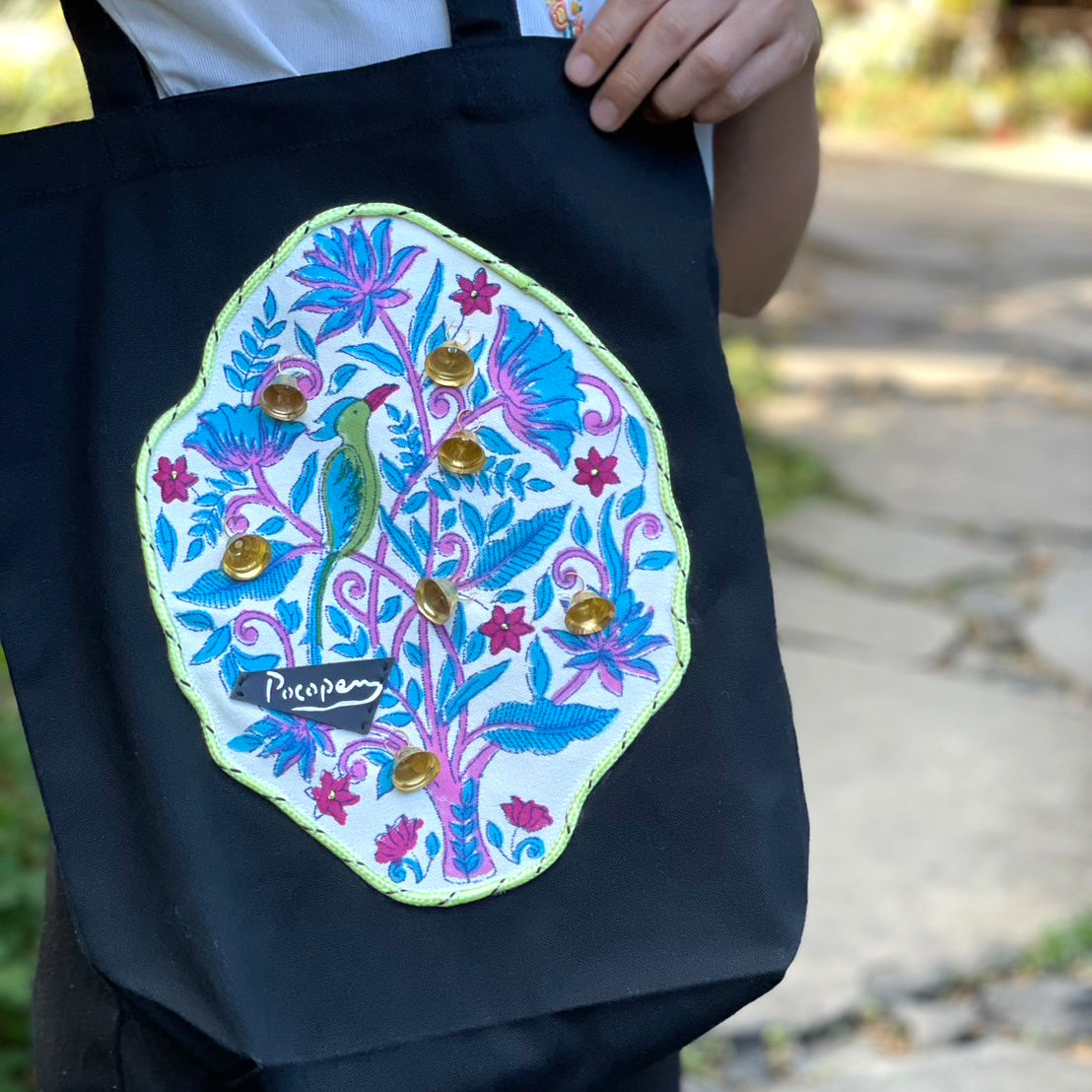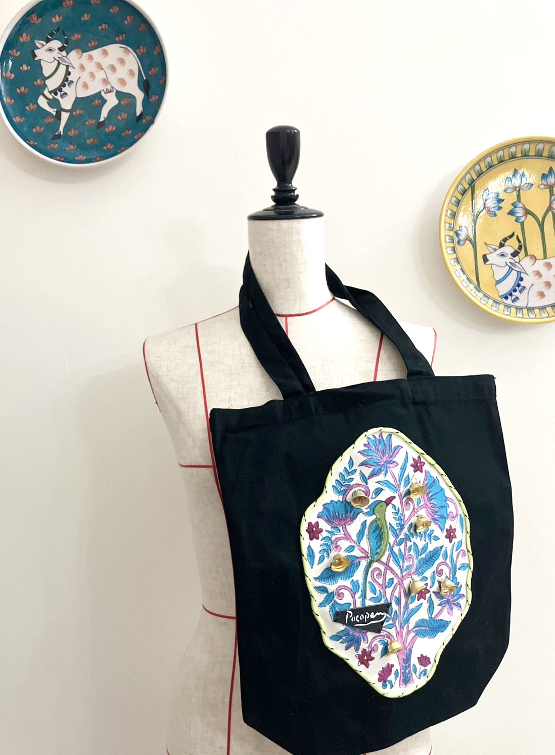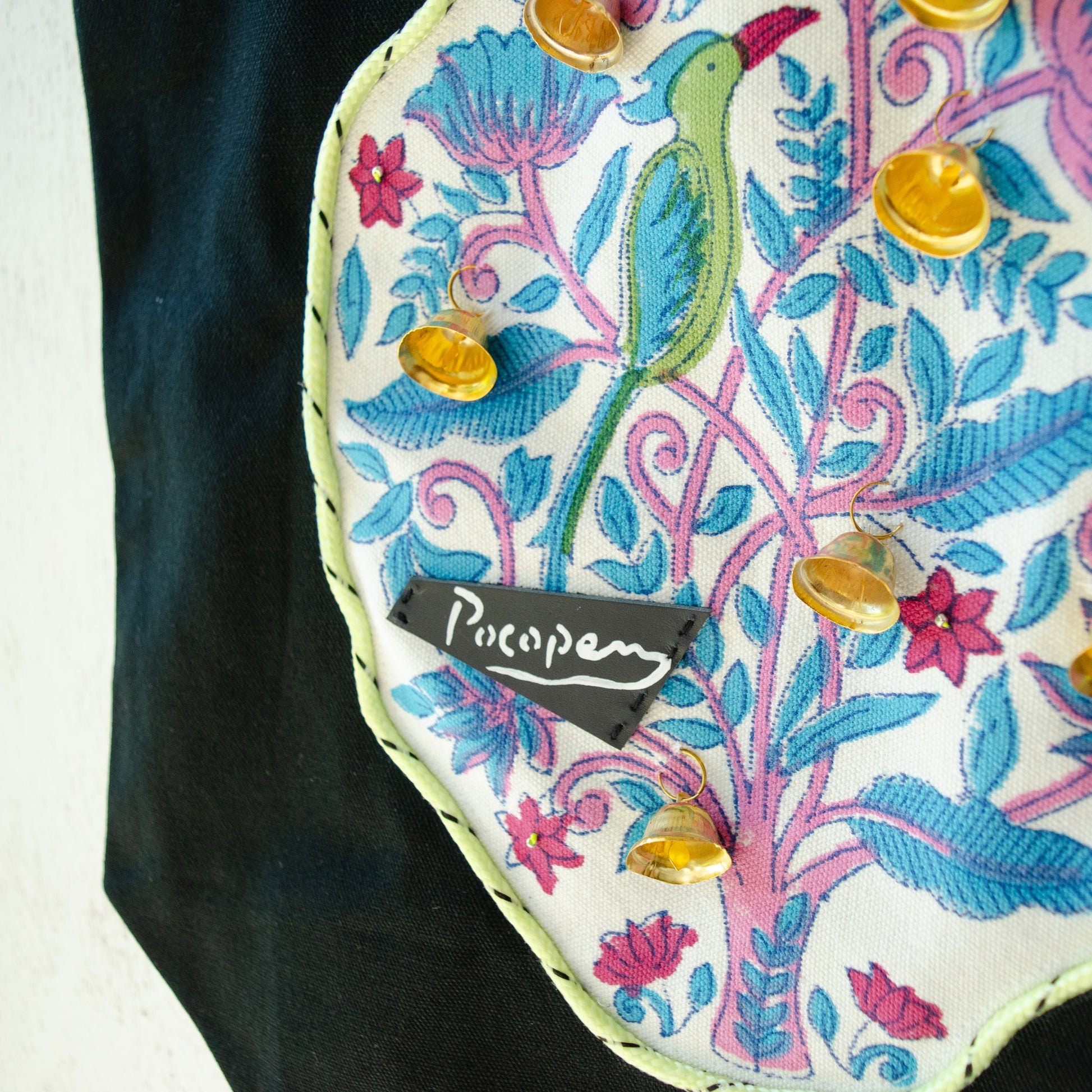 ハンドクラフトのキャンバス地布を使った、鈴がたわわに実ったトートバッグ。