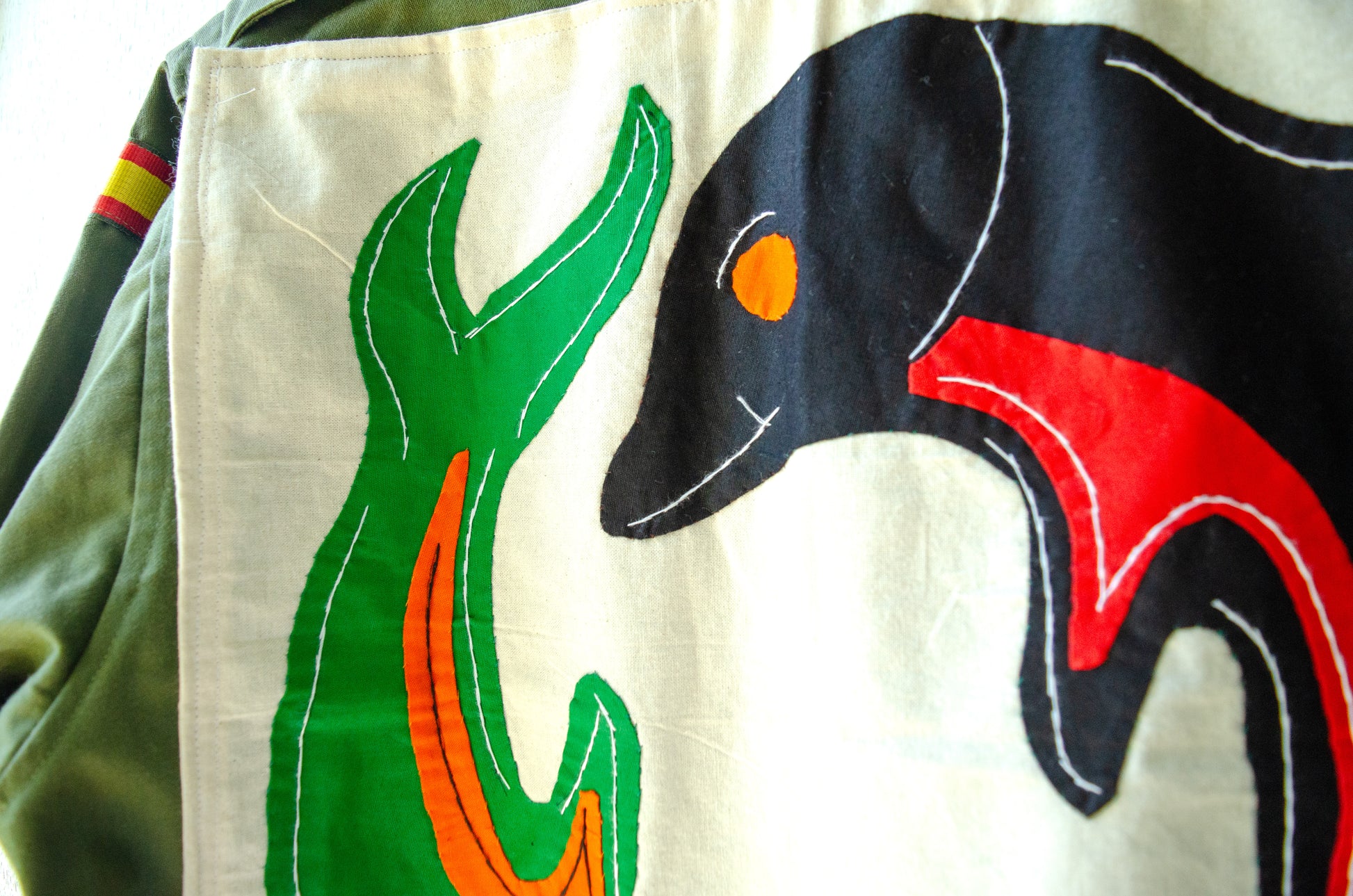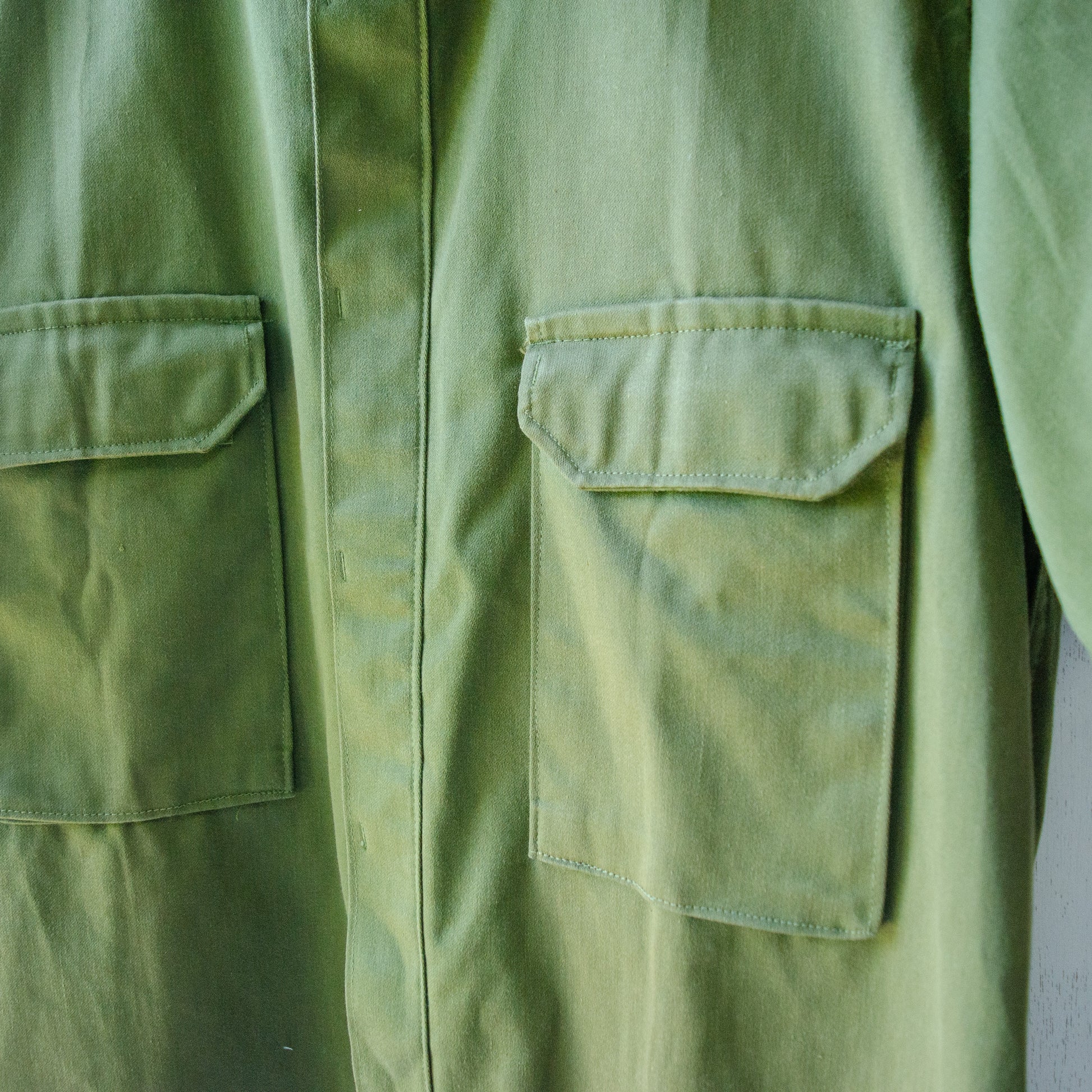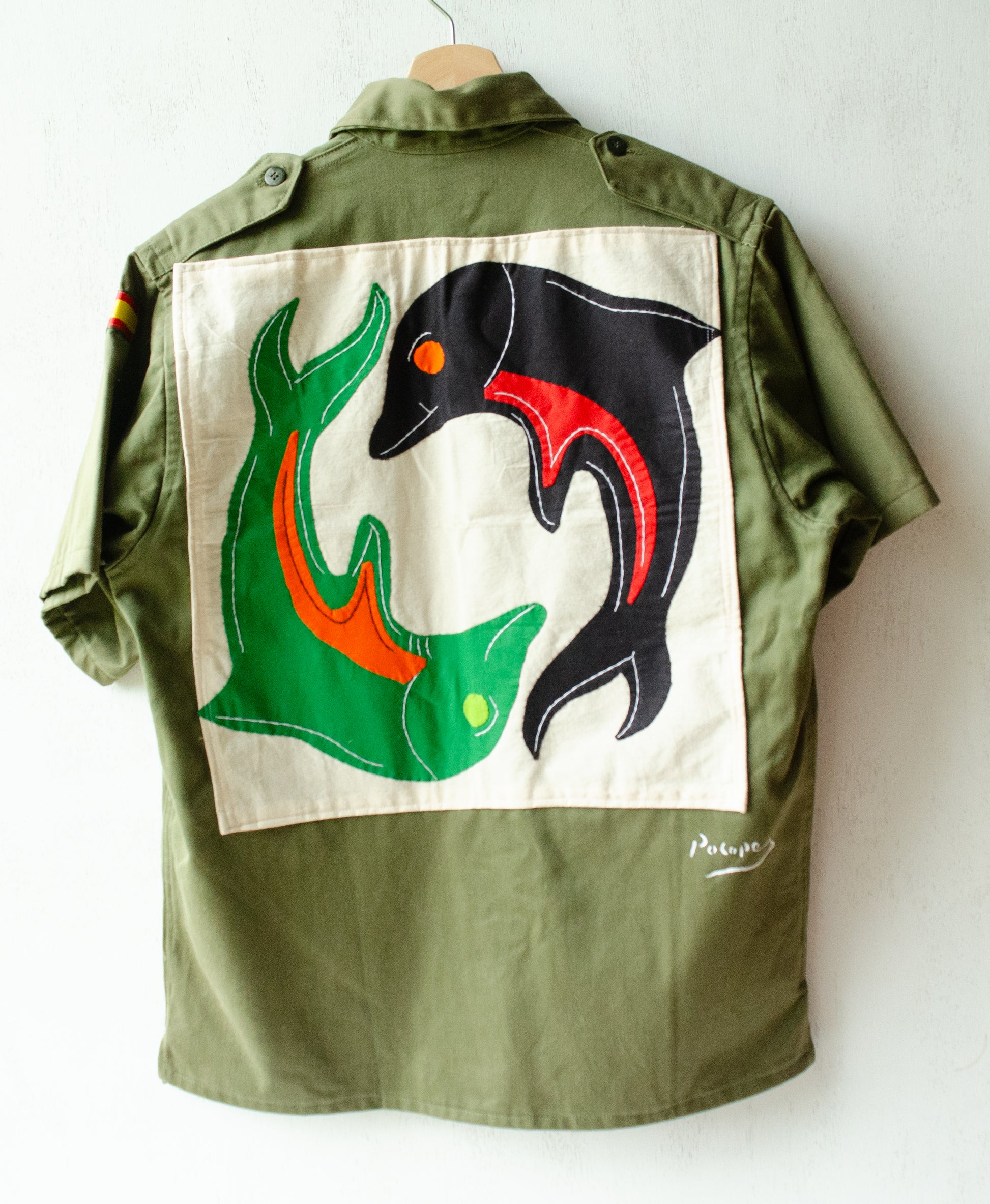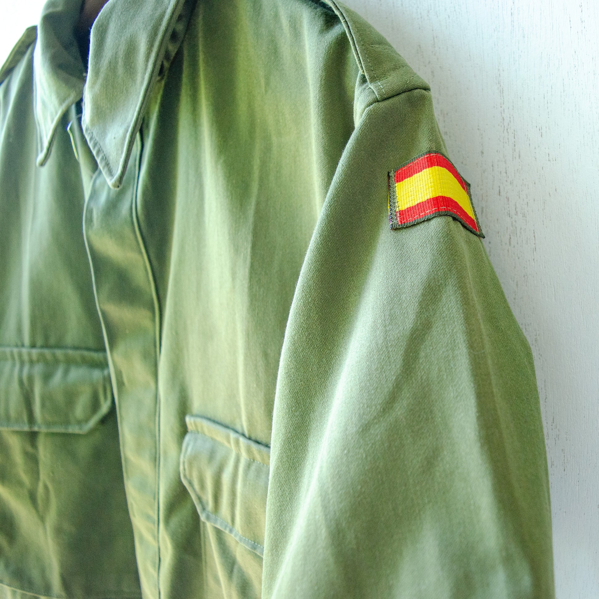 スペイン軍・ミリタリーシャツの古着とデザインを活かしつつ、あえてシンプルにリメイクすることで、裏と表で異なる雰囲気が楽しめる一点モノである。