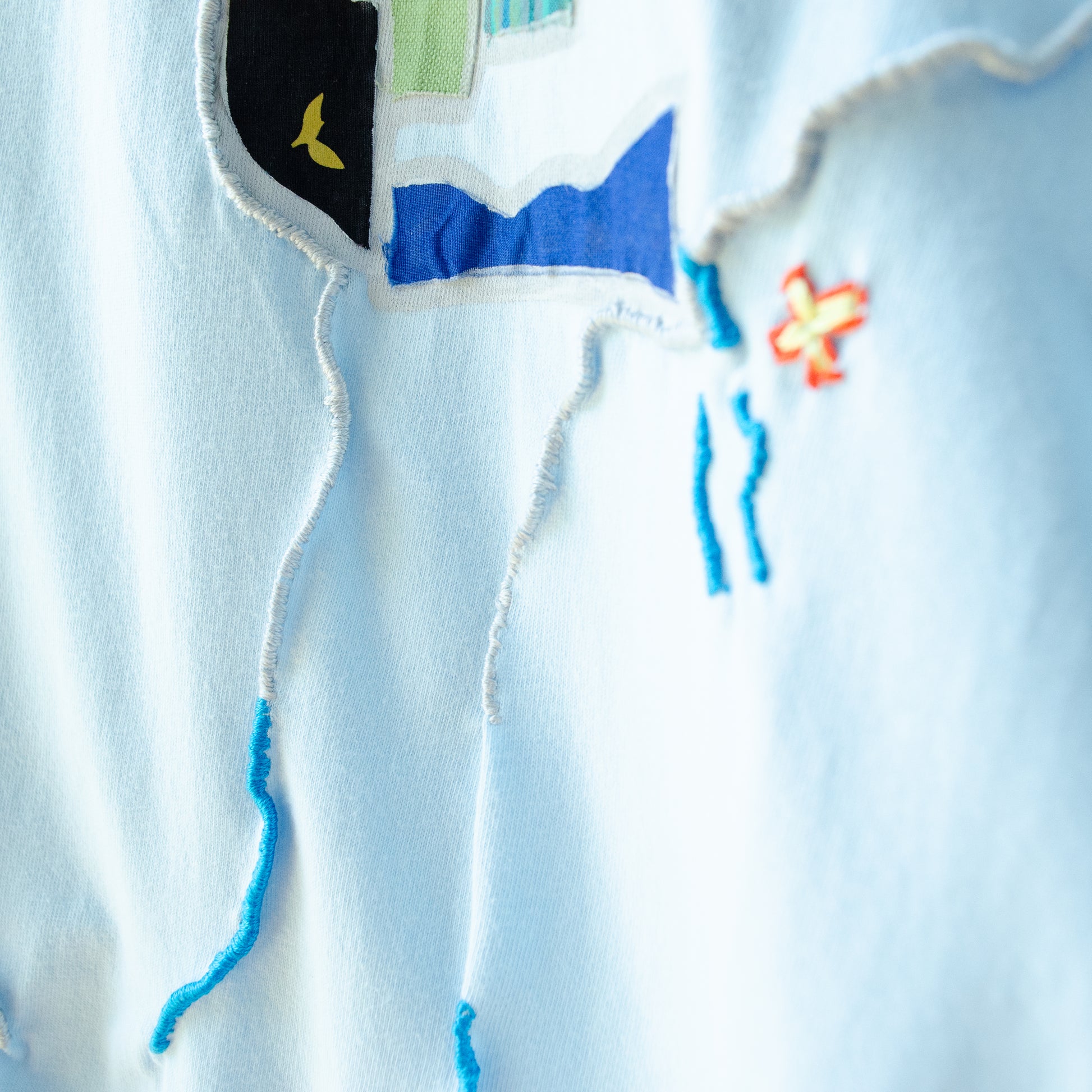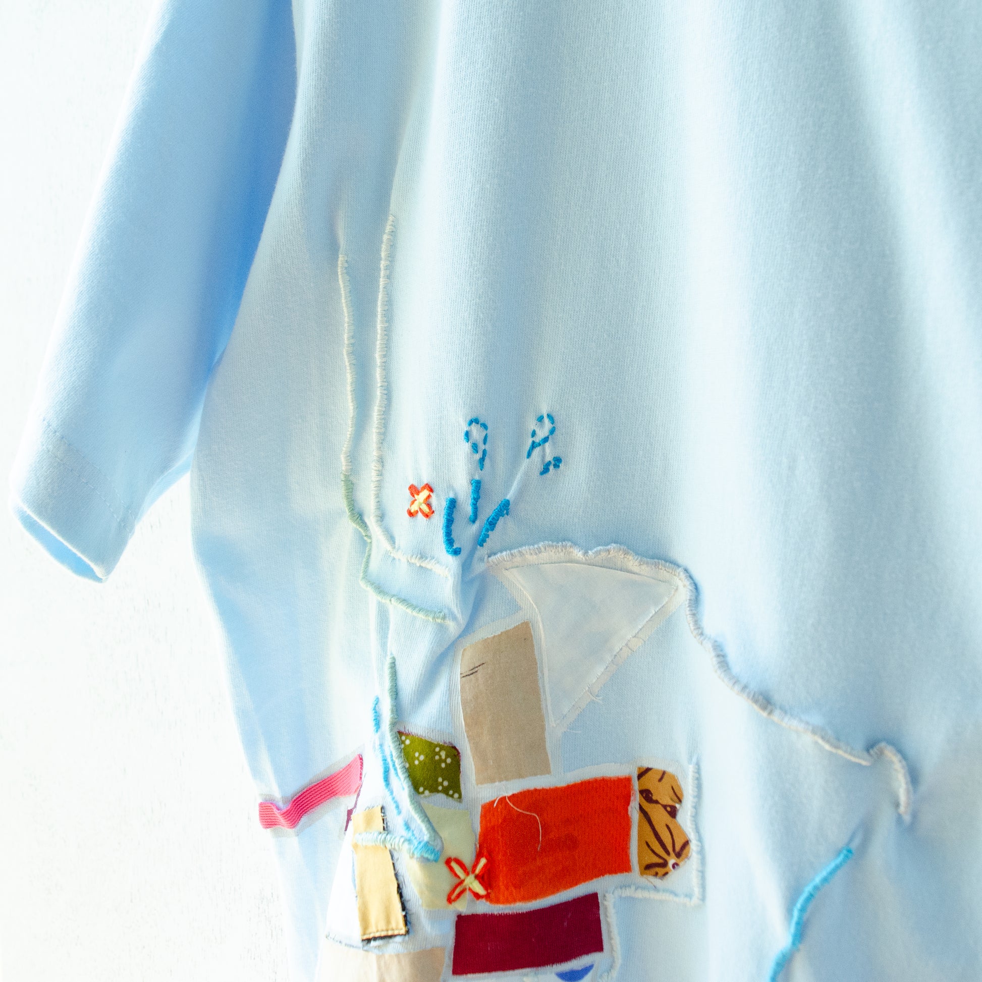 全体に大胆な刺繍がされており、異素材が型破りに組み合わされている。別名"beT(ベットT)"と名付けたこのシリーズは、「bet=賭ける」とTシャツをかけた造語である。どなたかに購入されるまで手を加え続け、価値が上乗せされていく商品であることを意味している。